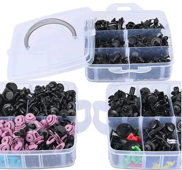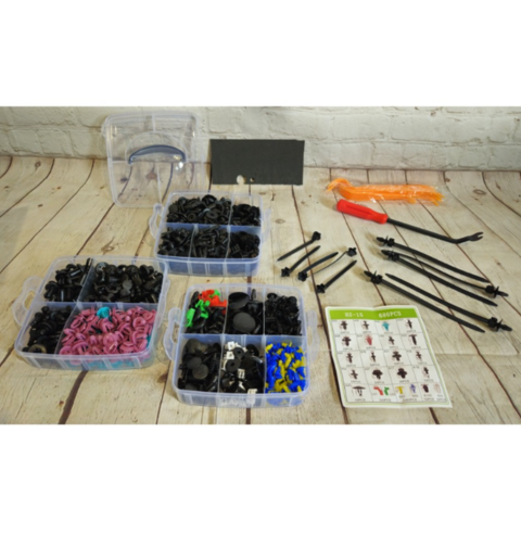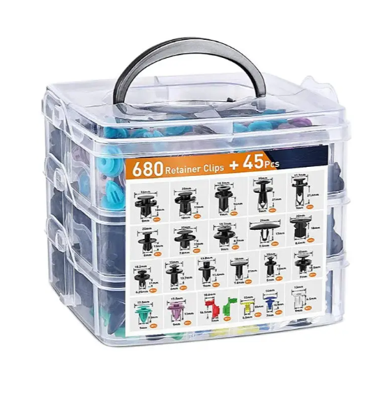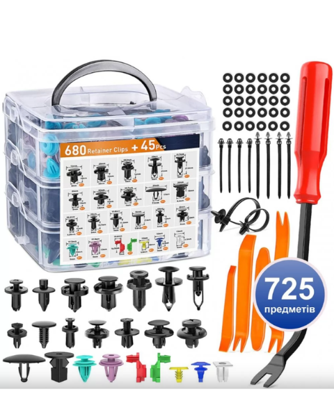 Набір автомобільних кліпс, кріплень і пістонів (725 деталей) — це універсальне рішення для ремонту та обслуговування автомобіля. У комплект входить великий асортимент фіксаторів, які підходять для більшості марок авто, а також спеціальні інструменти для швидкого та акуратного демонтажу.